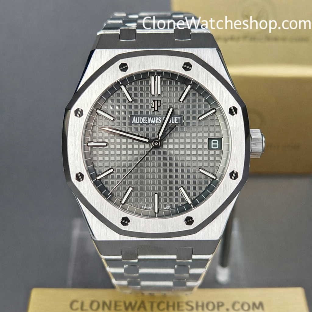 41mm Stainless SteelClassic Royal Oak geometry. The bezel screws are polished white gold (plated), contrasting with the brushed steel bezel.