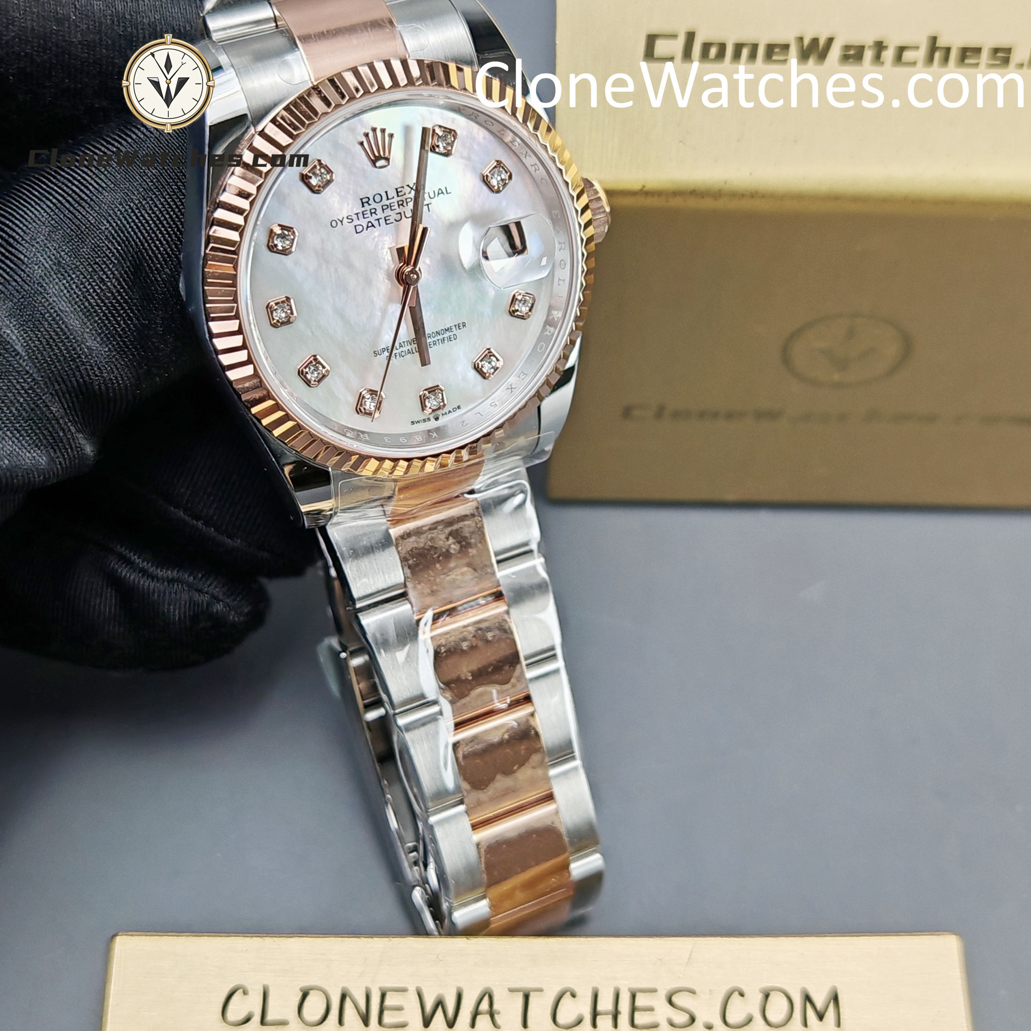 Powered by the latest Super Clone 3235 automatic movement, it delivers smooth performance and accurate timekeeping. The elegant mother-of-pearl dial is accented with sparkling diamond hour markers and the signature Cyclops date window, capturing the essence of timeless Rolex design.