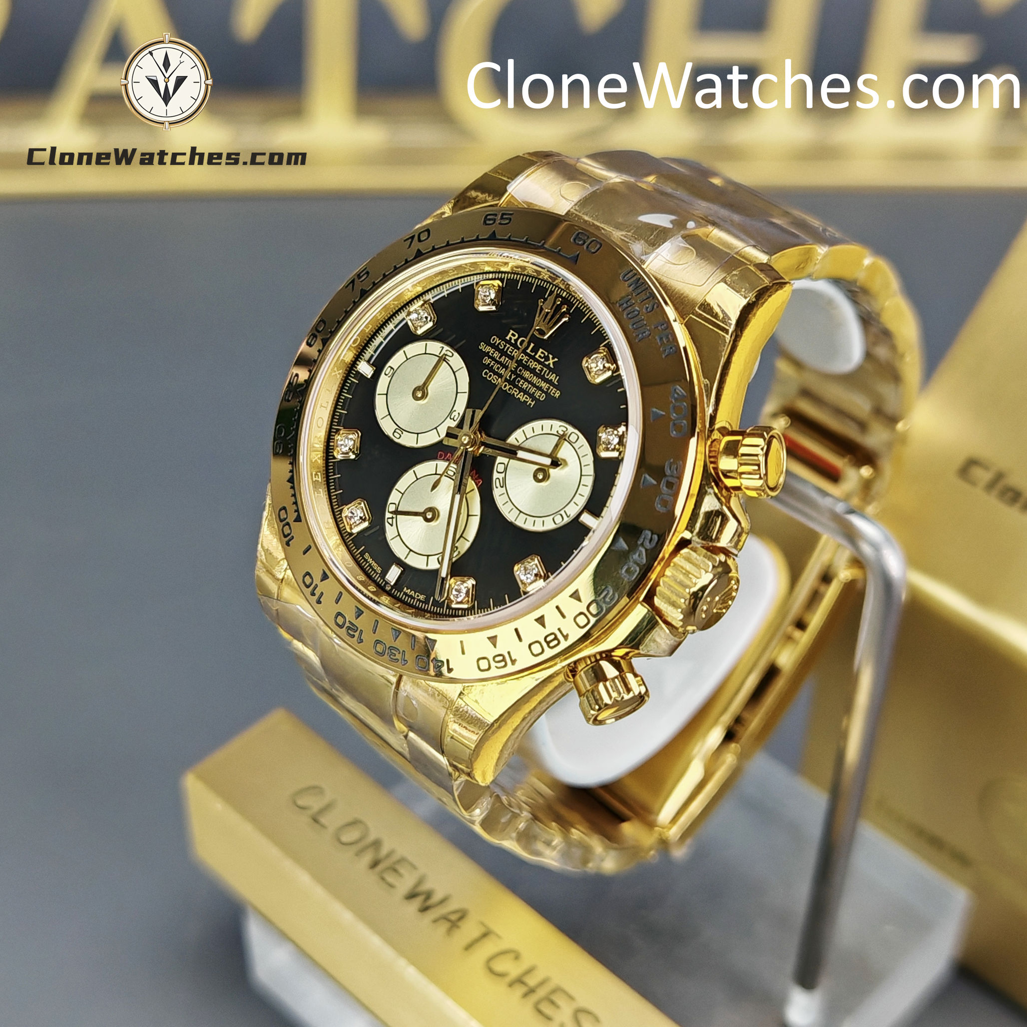 The entire watch (Case & Oyster Bracelet) uses a Tungsten-Steel base wrapped in 5-layer 18K Yellow Gold PVD. The tone is the correct 2N Yellow Gold, rich and vibrant, guaranteed against fading.