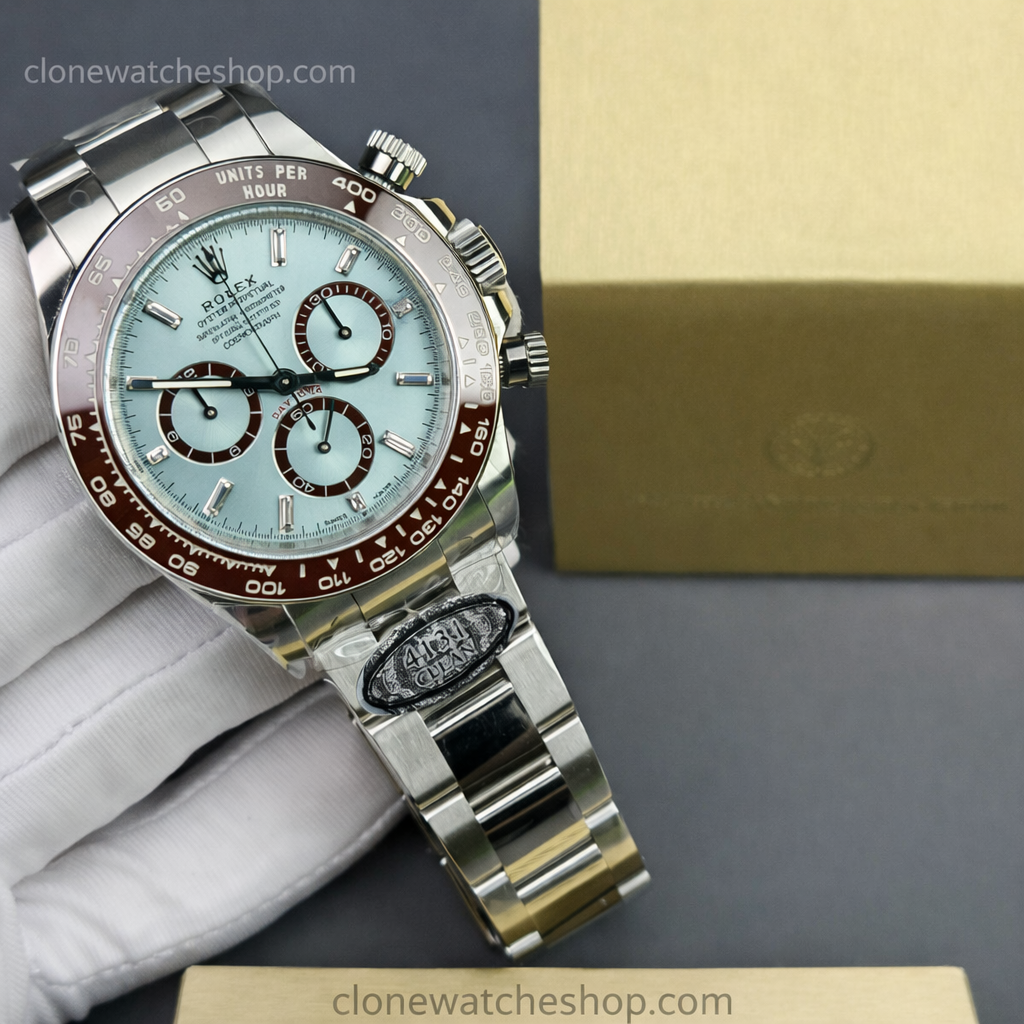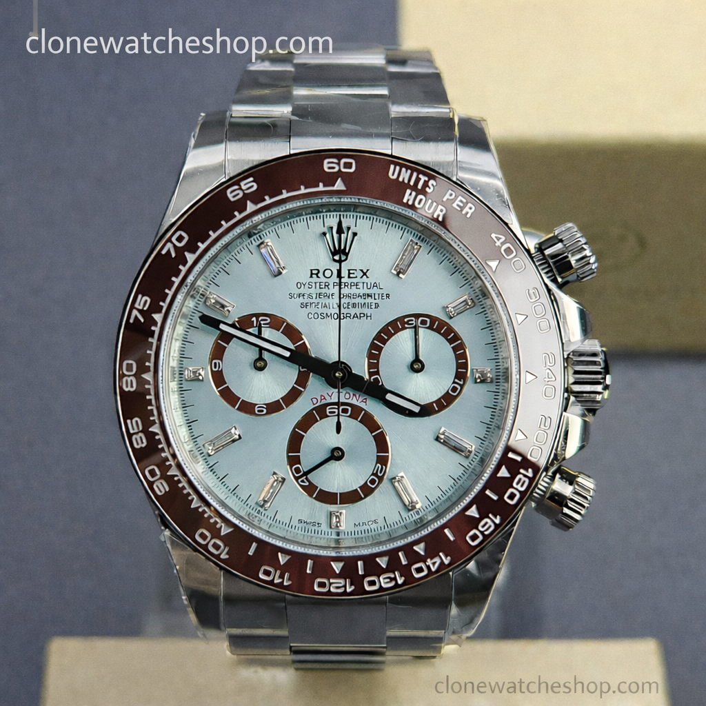 Chestnut Brown CerachromThe bezel is not black, but a deep, rich Chestnut Brown ceramic—a detail often missed by lower-tier factories. The tachymetric scale is moulded with platinum via PVD.